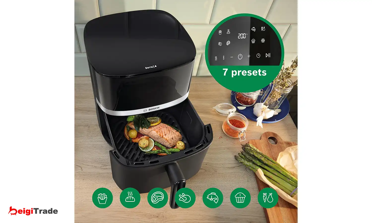 برای آشپزی آسانتر، این سرخکن به هفت برنامه از پیش تعیینشده مجهز شده است که پخت انواع غذا از ماهی و گوشت تا سبزیجات را ساده میکند. هر برنامه زمان و دمای مناسب را بهصورت خودکار تنظیم میکند تا بدون حدس و خطا به نتیجهای مطلوب برسید. همچنین قابلیت یخزدایی، آمادهسازی مواد غذایی را سریعتر کرده و نیاز به استفاده از وسایل اضافی آشپزخانه را کاهش میدهد.