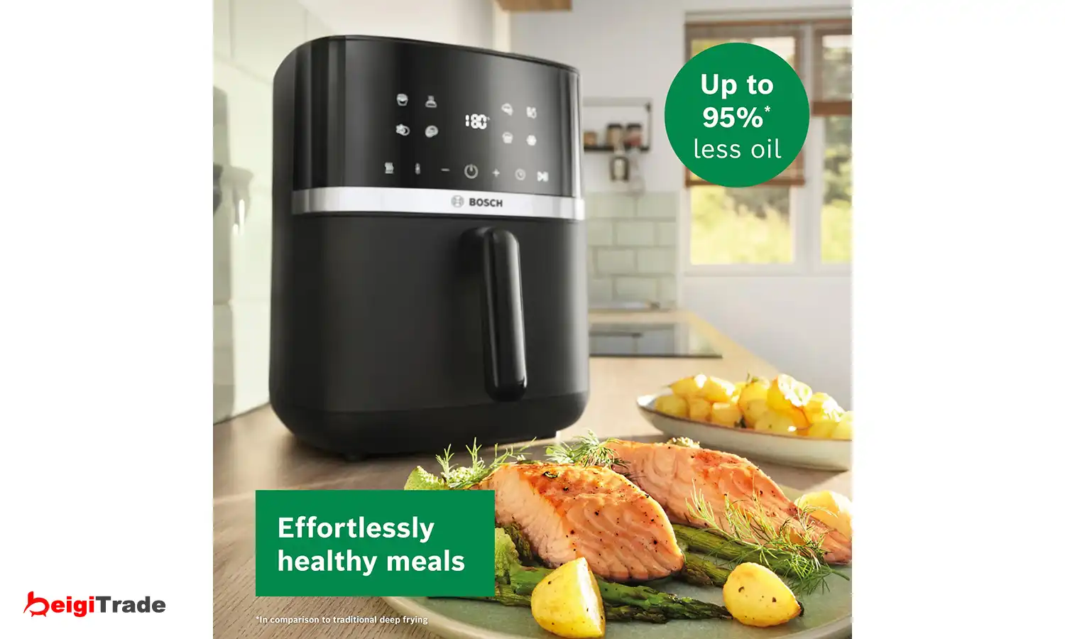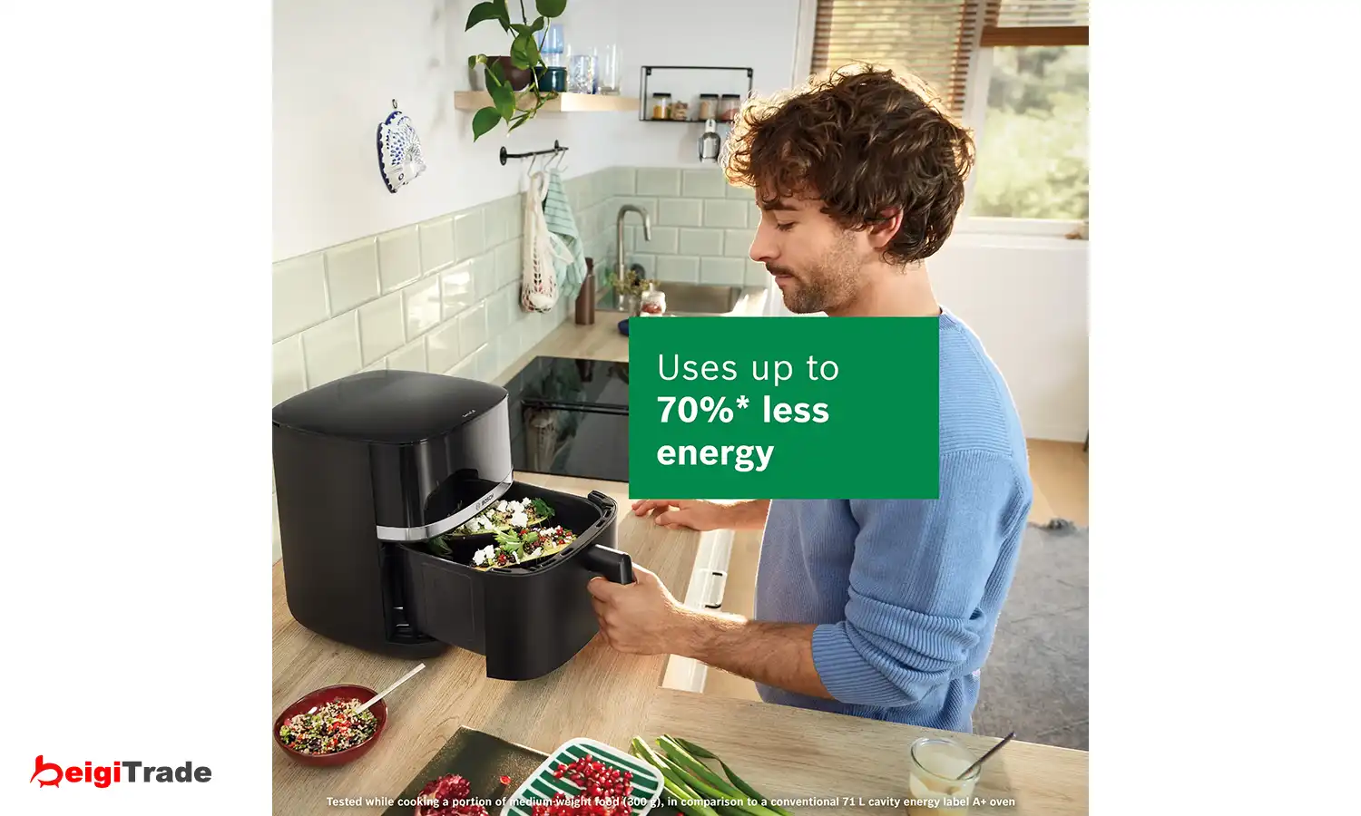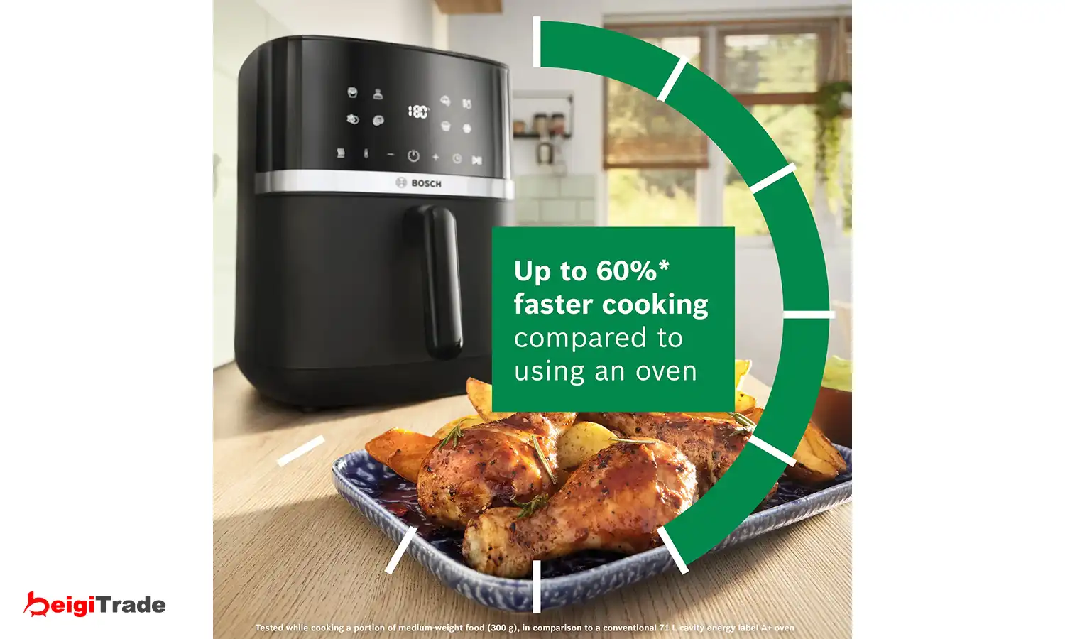 با بهرهگیری از فناوری سرخکردن با هوا و بدون نیاز به پیشگرمایش، آمادهسازی وعدههای غذایی روزانه سریعتر از همیشه انجام میشود. سرخکن بدون روغن بوش سری 4 زمان پخت را تا 60٪ سریعتر کاهش میدهد تا زمان کمتری را منتظر بمانید و زمان بیشتری را صرف لذت بردن از غذا کنید. همچنین این عملکرد به کاهش مصرف انرژی تا ۷۰٪ کمک میکند. این نتایج بر اساس آزمایش پخت یک وعده غذایی با وزن متوسط 300 گرم در مقایسه با فر معمولی 71 لیتری با برچسب انرژی A+ به دست آمده است.